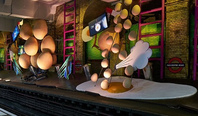 It features various large-scale egg related fibreglass sculptures, including two four metre high 3D eggs, a huge automated whisk, 12 65" video screens and 16 printed panels alongside oversized suspended images.