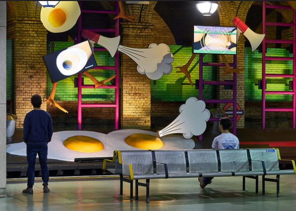 Passengers travelling through Gloucester Road tube station have been startled to see an eggs-traordinary new art installation pop up on the station's disused platform.