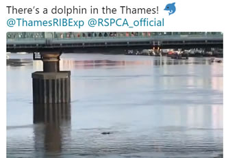 Amy Clayfield tweeted video footage of the dolphin on Sunday 29 October by the District Line bridge and footbridge over the Thames from Putney to Fulham.