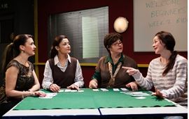 Clumsy stage direction gets in the way of the flow. The only props are four tables and chairs that are put together for the card games. Each scene change is marked by the chairs being shifted and the tables being pulled apart and put together again.