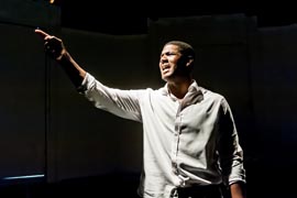 Played in a room bare but for occasional illustrative posters and with music provided solely by the keyboard of Harry Haden-Brown, it is a production that is the antithesis of the dream factories that grew as fast as Topsy in Southern California. Four chairs and a movie camera that looks as if made from hastily glued-together cardboard must have exhausted the props budget. The girls’ costumes mostly pass the period test, but poor Griffiths would have sweltered to death if he’d continued to wear a formal business suit after moving to the sun-soaked coast.