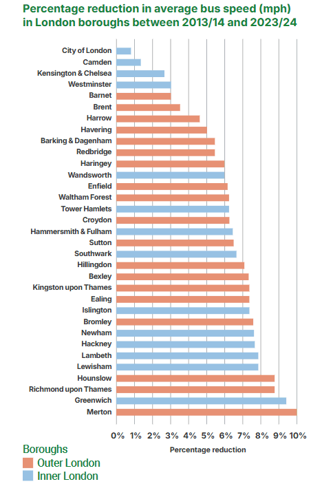The average speed of buses in Hounslow is now 9.4mph compared to 8mph in Hammersmith & Fulham and 9.3mph in Ealing. Outer London boroughs tend to have higher average speeds than those closer to the centre.