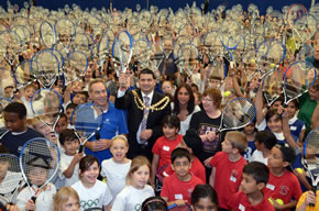 The children, from more than fifty schools across the borough of Hounslow took up the challenge at Dukes Meadows sports centre in Chiswick today (June 26), a local centre which specialises in coaching children in tennis. The event was timed to coincide with Wimbledon.
