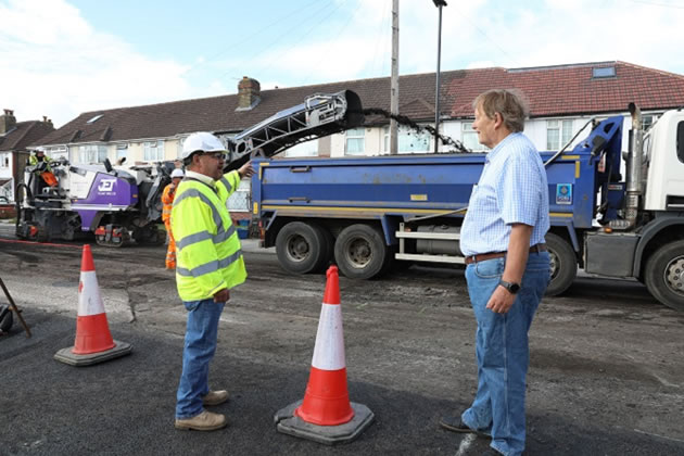 Cllr Guy Lambert (left) sees a road being resurfaced. Picture: Hounslow Council