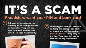 Please make sure that any elderly or vulnerable people that you care for are aware of this scam and know that they must hang up the phone or close the door if anyone tries to discuss their bank account, bank card or PIN.
