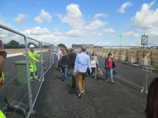 Staff from TfL are positioned on both sides of the bridge to assist passengers.