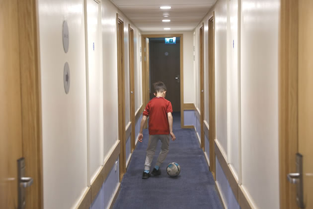 Boy temporarily housed turns a hotel corridor into a football pitch. Picture: Facundo Arrizabalaga/Mylondon