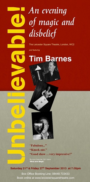 Brentford-based London Magician, Tim Barnes, is pleased to announce a brand new show at the Leicester Square Theatre, and running for 2 evenings only.