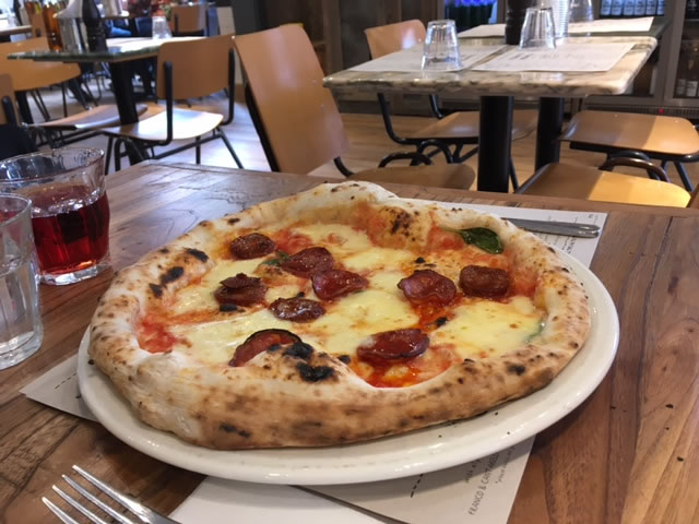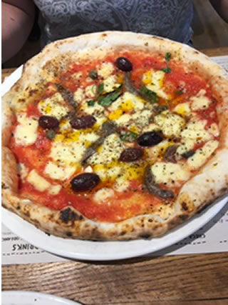 Glancing at the next table we decided that the size of the pizzas would not need a starter so straight to the pizzas.... The menu is simple there are seven pizzas plus two specials * (one veggie one carnivore) on offer daily, salads are only side dish portions and a selection of Italian desserts. * Most of the cheeses used on their specials come from small producers of the British Isles.