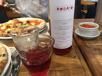 We share a bottle of unfiltered Rossato wine from Sicily - which was a deep pink (nearly red) in colour but dry to taste