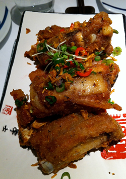 To start we selected Lettuce Wrapped Crispy Lamb served with plum sauce (£9.80) and Chiu Yim Ribs tossed in peppercorns and spiced salt (£8.80). I’ve previously enjoyed diced pork that you roll up in iceberg lettuce leaves and this was a spectacular variation. The lamb, crisped and shredded in the manner of Chinese crispy duck, was fully of lovely lamby flavour and the plum sauce was light, zingy and fresh, so ideal with lamb, and nothing like the solid brown gloop usually labelled as plum sauce.