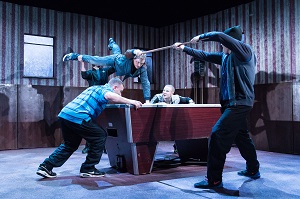 Because it’s produced by Frantic Assembly who specialise in physical theatre, there’s plenty of music and dancing intermingled with the story, starting with an exhilarating opening sequence. The choreography’s great, the cast are young, lithe, beautiful and amazingly fit, leaping on and off the snooker table and wielding their cues to the beat of an ultra-loud electronic soundtrack.