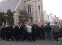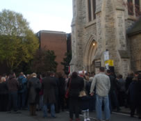 Leysfield Road was closed to traffic for the evening and, as the church filled up, crowds of mourners stood in the street outside, with extra chairs brought out for the elderly. Many arrived with flowers, which were laid next to a crucifix and candles in the front courtyard of the church.