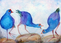 "'Gossiping Gals' are three Purple Swamphens from Madagascar which I saw at the Cotswold Wildlife Park last year," said Dennistoun. "It is a walk-through area dedicated to Lemurs and these colourful birds. I was totally focused on my drawing, when a black lemur leapt on to a nearby post, seized my sketchbook, took one look at my drawing and scampered up a tree. One of the hazards of drawing from life!” she said.