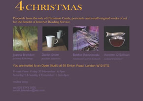 There will be paintings, handwoven textiles, jewellery and ceramics on display. Joanna Brendon will include some originalsmall artworks, Christmas cards and postcards for the benefit of the InterAct Reading Service. (www.interactreading.org) which supports stroke recovery.