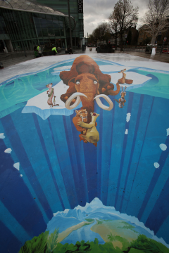 The pavement art took six days to create and includes Ice Age 3 characters Manny, Buck, Sid, Diego, Scrat and Scratte positioned over an icy crevasse.