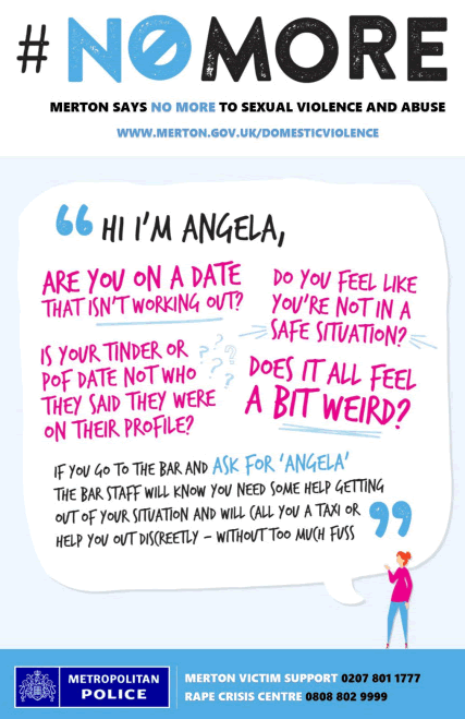 Ask for Angela is part of the UK Says No More campaign, run by the charity Hestia. Now Merton Council and Merton Police are running the scheme in the borough.