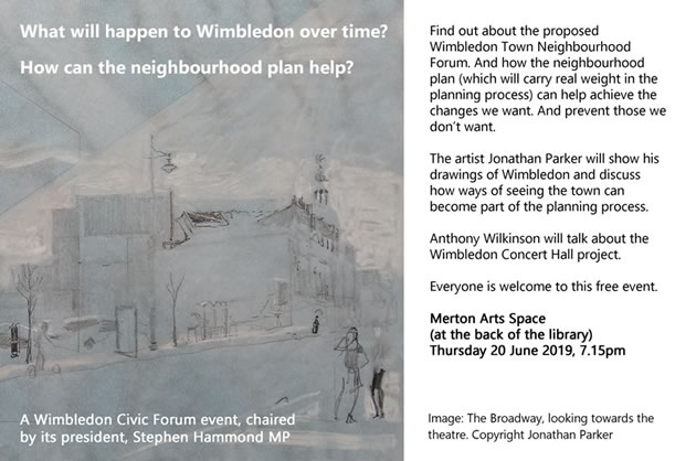 Subsequently he has organised a Wimbledon Civic Forum event on 20th June with the help of Marcus Beale Architects, to raise awareness of the Wimbledon Town Neighbourhood Forum for both residents and businesses. He will be showing all 30 of his recent Wimbledon drawings - hanging them together for the first time in the Library’s Arts Space - to help form a basis for debate about the neighbourhood. This will be chaired by Stephen Hammond MP. There will also be a talk by Anthony Wilkinson, trustee of the Wimbledon Concert Hall project.