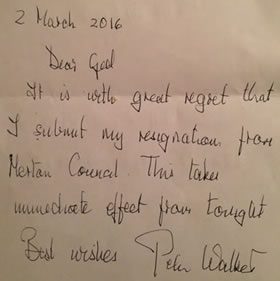 Peter Walker, who lives in Caroline Road, Wimbledon, later wrote to council leader Stephen Alambritis to explain his reasons for resigning. He stated: "I did this for two reasons; firstly because by banning me from all council committees since 2014 I have been unable to represent those who voted for me.