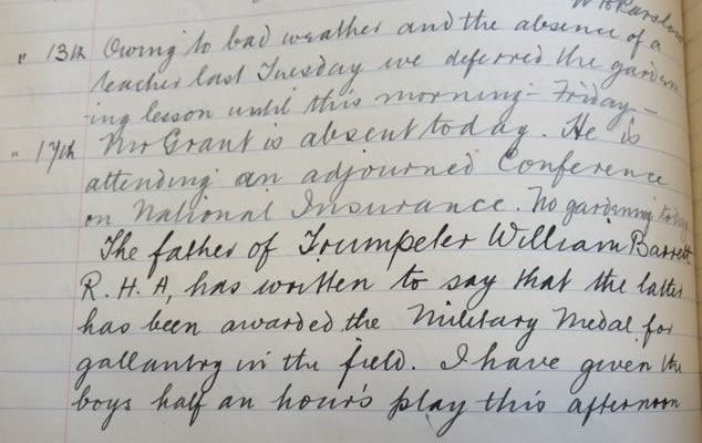 When he was awarded the medal, his father Henry Gulliver Barrett wrote to the headmaster of Singlegate School to report this news about their 'old boy' and the school log book states the following (see below): "The father of Trumpeter William Barrett RHA has written to say that the latter has been awarded the Military Medal for gallantry in the field. I have given the boys half an hour’s play this afternoon in his honour."