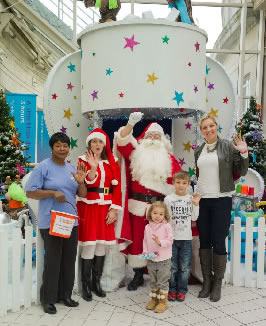 (L-R) Joan Henry, a volunteer at Volunteer Centre Merton, with grotto helper Rachael Seaforth-Brown and Santa, with youngsters Rose and Merlin Lewis, and mum Leslie Lewis